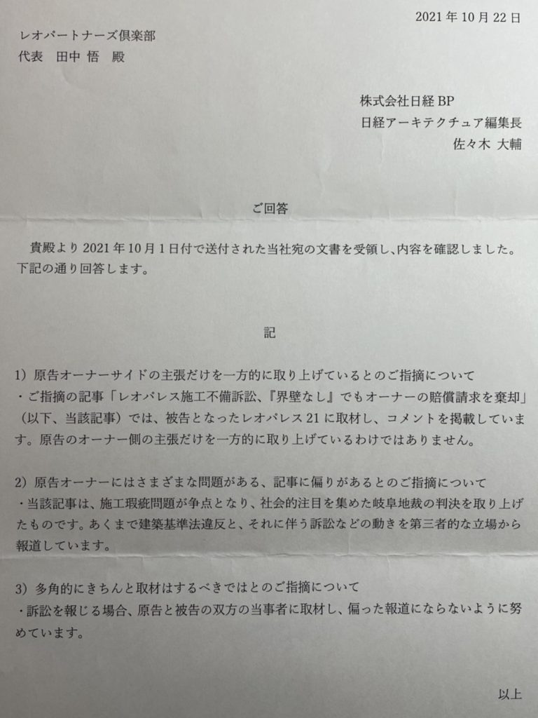 この判決結果が出ています。まず東京地裁で申立却下が決定。納得がいかない原告は即時抗告を提起しています。そして東京高裁の決定は抗告棄却。今年3月末に東京地裁による判決いい渡しがあり、レオパレス21が勝訴したことになりました。